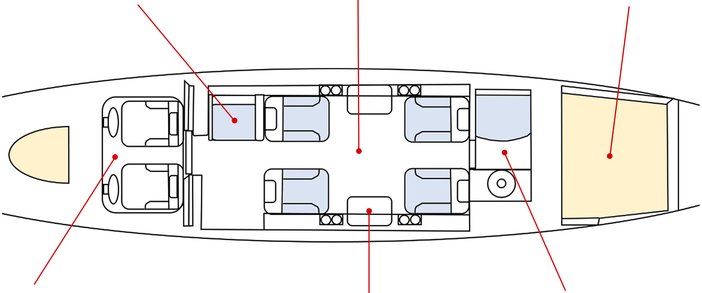 胴体後部のエンジン支持構造をなくすことによりキャビン(客室空間)内部のスペースを最大限に活用することができ、同クラスでは比較的広いキャビンを持っております。