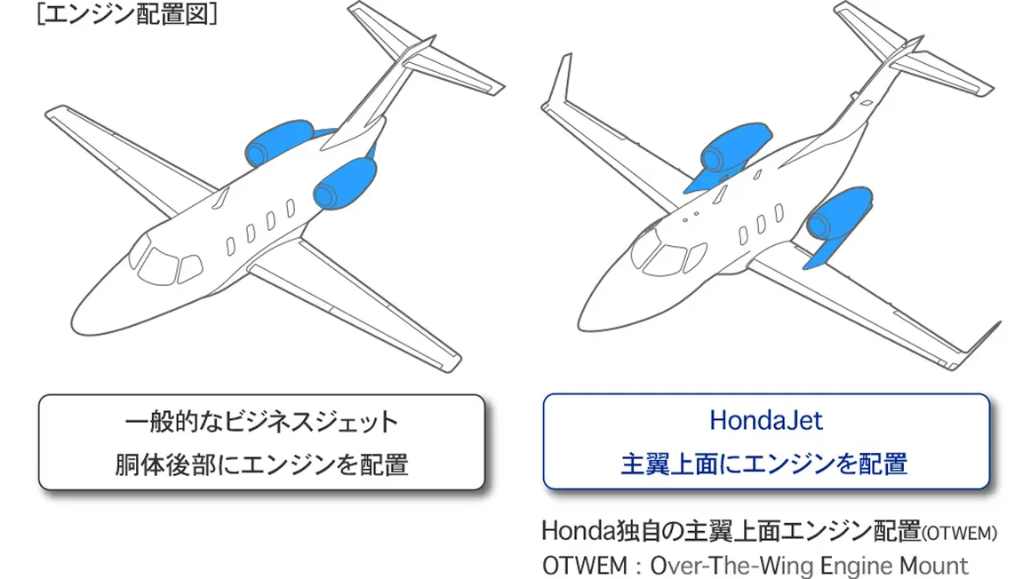 HondaJet は、胴体後部のエンジン支持構造をなくして内部スペースを最大限に利用できるようにするため、ビジネスジェットとして世界で初めてエンジンを主翼上面に配置されています。